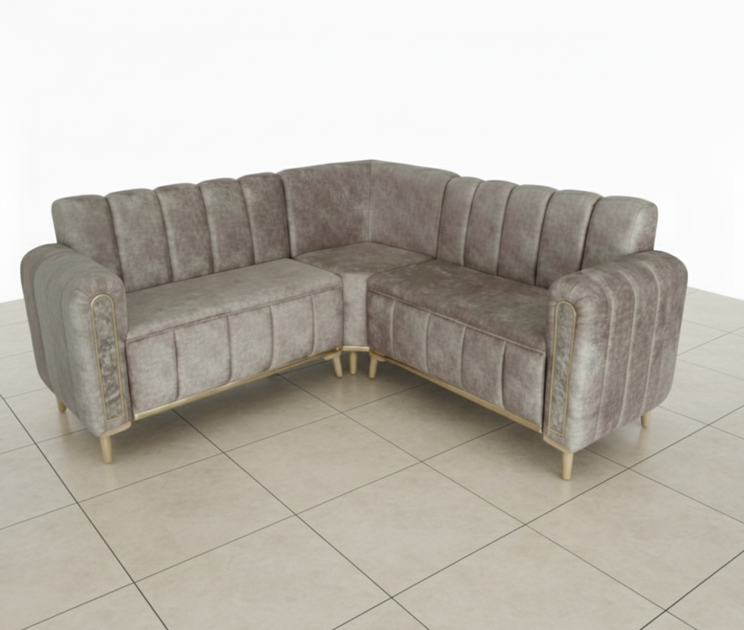 أريكة فاخرة على شكل L مصممة لقاعة الضيوف، مصنوعة بإتقان من الخشب ومغلفة بقماش عالي الجودة.