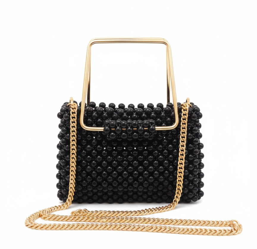 حقيبة يد سهرة جزائرية مصنوعة بدقة من الكرات السحرية، تجمع بين الأناقة والحرفية العالية.