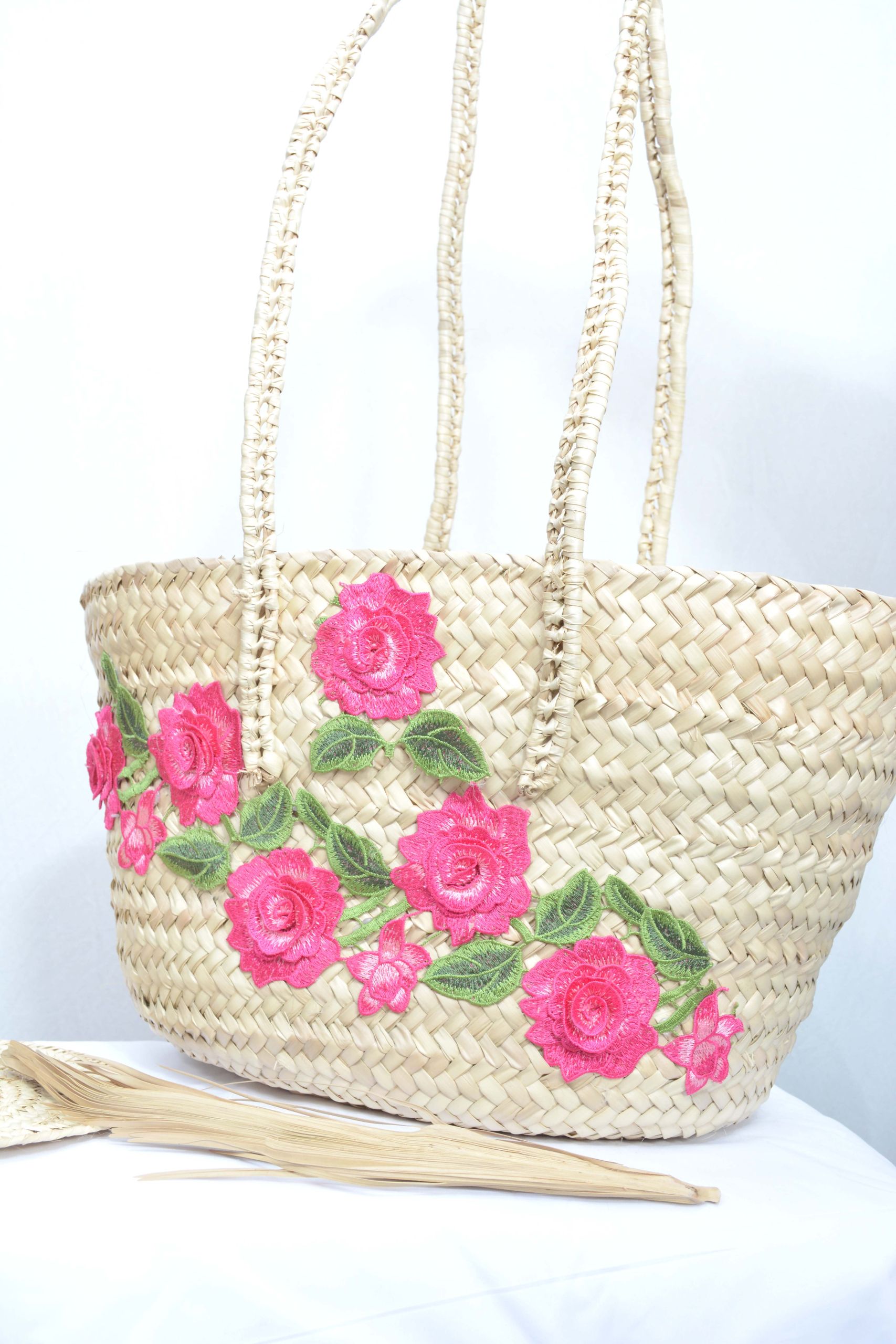 منتوج جزائري يتمثل في سلة كبيرة الحجم مصنوعة يدويا من مادة الدوم الطبيعية، مزينة بأزهار متعددة الألوان تضيف لمسة جمالية مميزة، تجمع بين الإتقان والحرفية التقليدية.