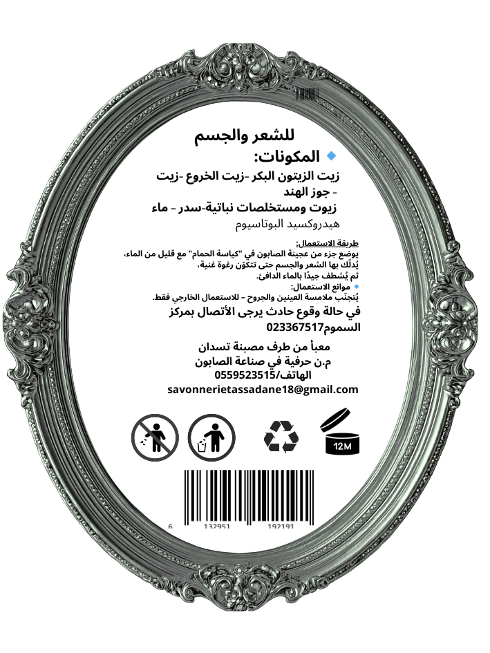 المكونات الأساسية: زيت زيتون بكر، زيت خروع، زيت جوز هند، مستخلص نبات السدر، ماء هيدروكسيد البوتاسيوم.
