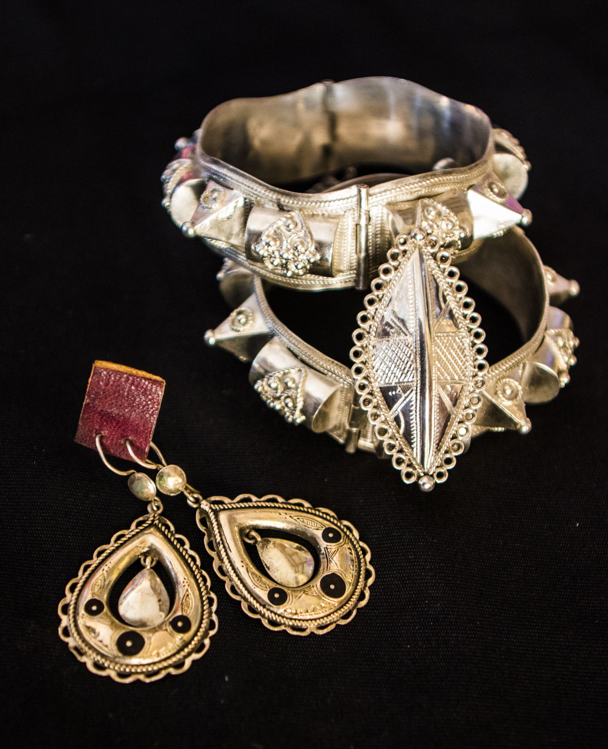 حلي تقليدي فاخر يمثل طاقم نسائي متكامل مصنوع من الفضة الخالصة ومرصع بأحجار كريمة مختارة بعناية، يجمع بين الفخامة والدقة في الصنع ليعكس جمال التراث الجزائري وأصالته العريقة.