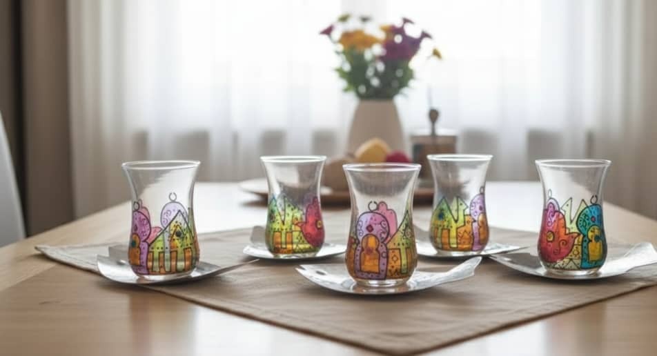 طاقم شاي زجاجي جزائري مصنوع بعناية، مزين بألوان مائية خاصة بالزجاج ذات جودة عالية ولمسة فنية راقية.