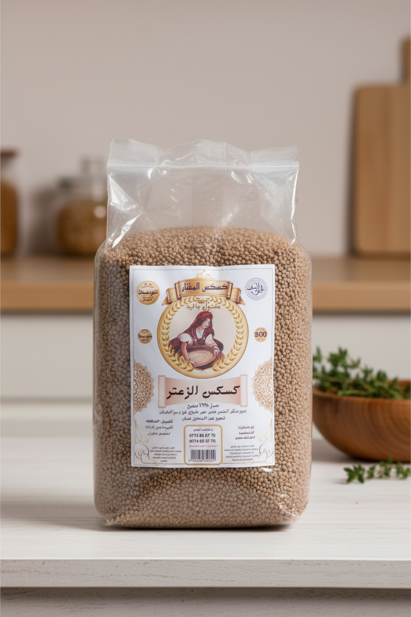 • كسكس الزعتر مفتول باليد مكون من سميد القمح وزعتر مجفف ومطحون .