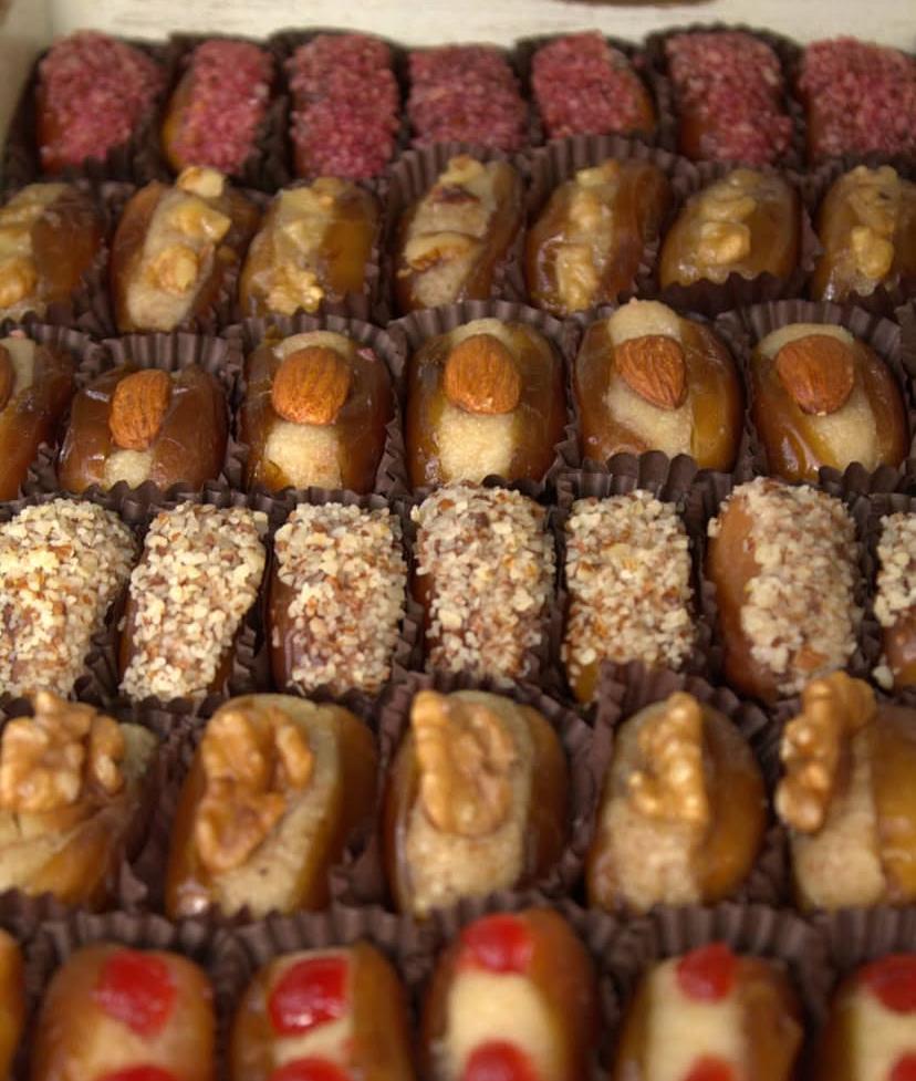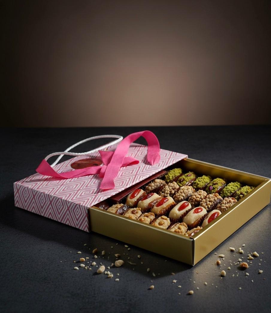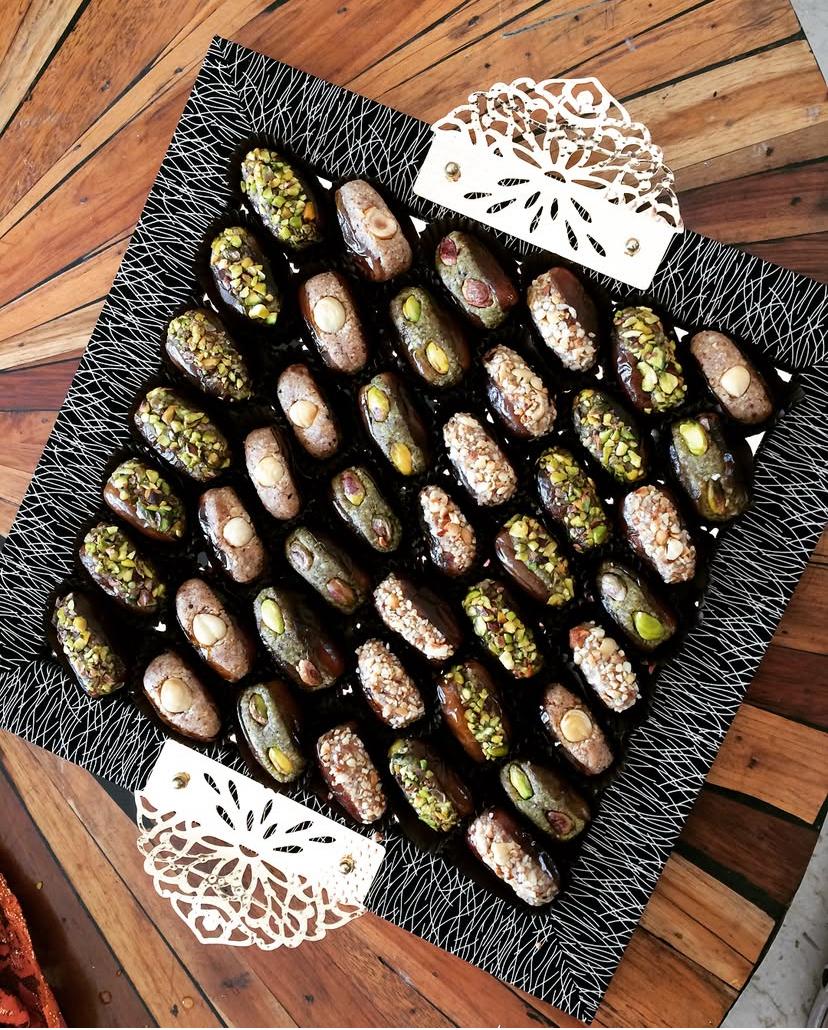 حبات تمر مغلفة بالشوكولاتة الفاخرة، محشوة بنكهات متنوعة من المكسرات مثل اللوز، الجوز، والبندق، تجمع بين المذاق الأصيل للتمر الجزائري وجودة الشوكولاتة الرفيعة. منتوج جزائري يجسد التميز في الحلويات التقليدية بطابع عصري.