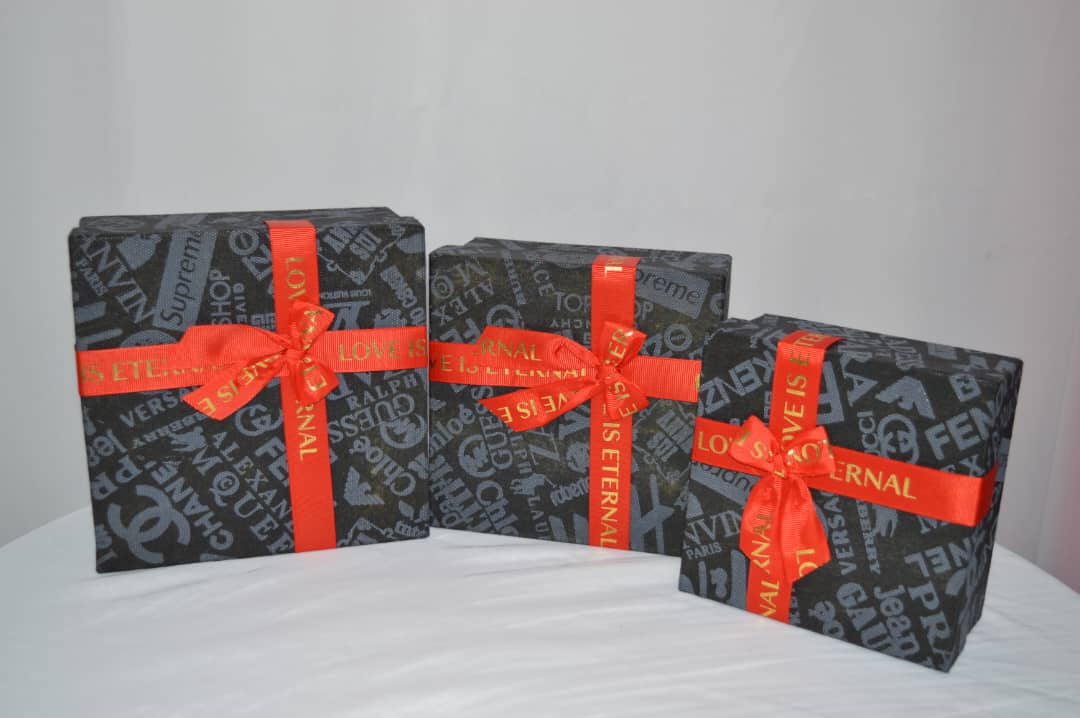 : علب هدايا أنيقة مصنوعة من الكرتون الغليظ بجودة عالية، متوفرة بأحجام متفاوتة تناسب مختلف أنواع الهدايا، تتميز بتصميمها البسيط والعملي.