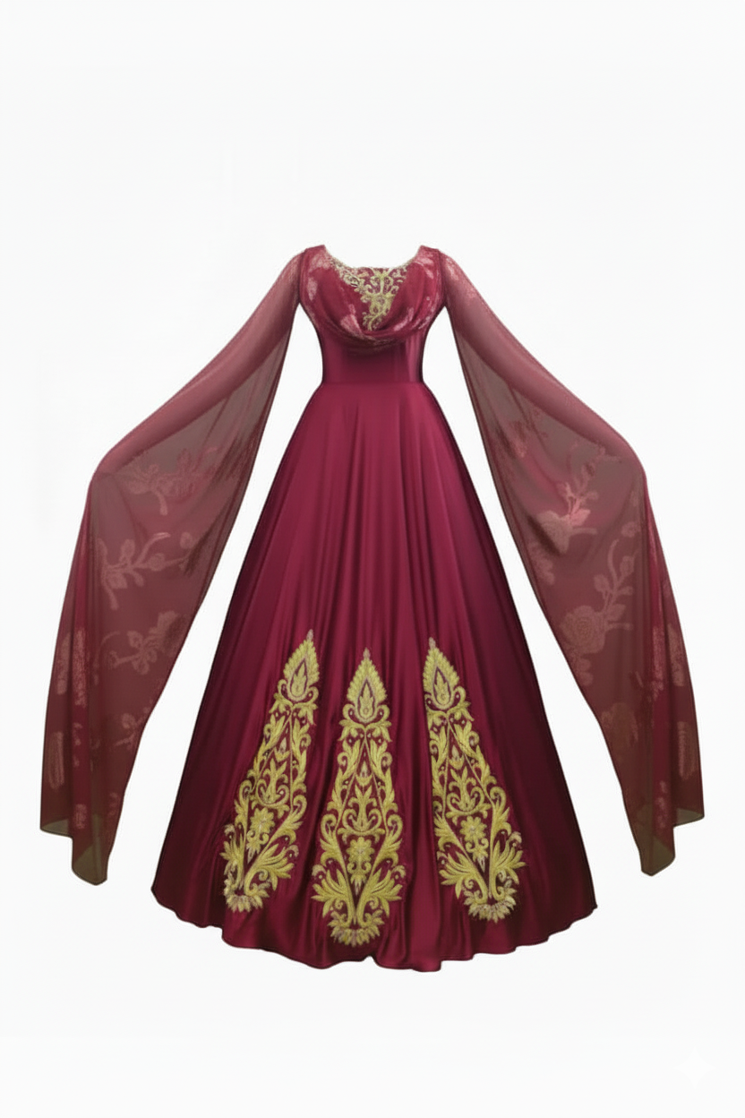 ملحفة شاوية بلمسة عصرية من صنع جزائري، القندورة مصممة من قماش المخمل بلون أحمر داكن راق يعرف بملمسه الناعم ولمعانه الهادئ، مطرزة بخيط الشعرة الذهبي الاصلي مزينة بأحجار الكريستال اللامعة يضفي لمسة ذات طابع تراثي،مع كاب من قماش الصدف الاصلي التقليدي مناسقا لفخامة القندورة ,الملحفة مناسبة لكل امراة جزائرية تبحث عن التميز باطلالة تجمع بين الاصالة والرقي
