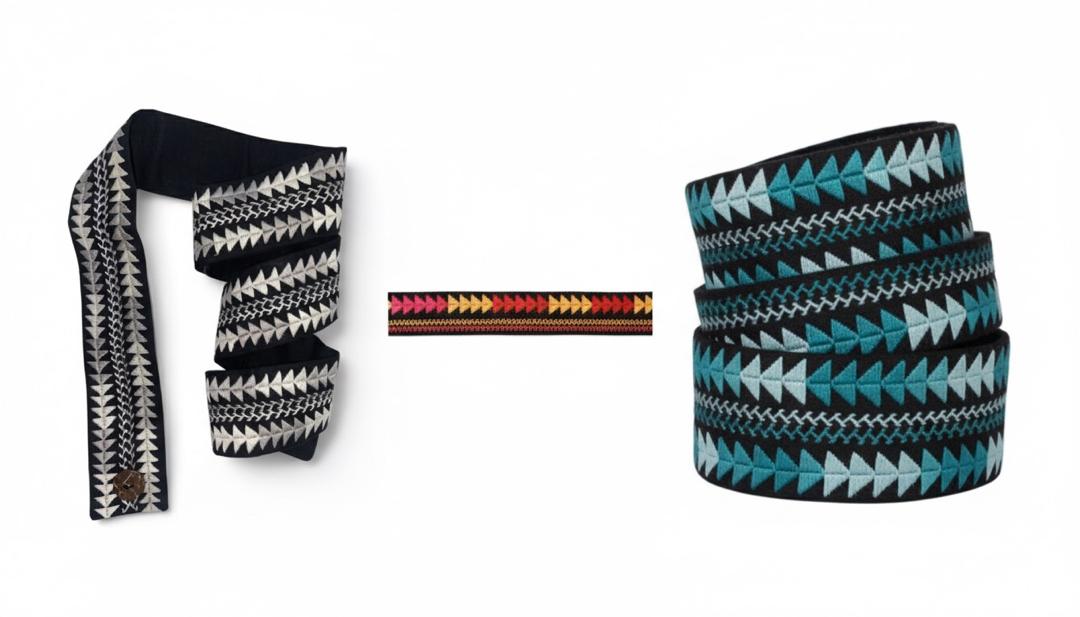 Ceinture brodée à la main sur tissu noir en laine, ornée de motifs en forme d’arêtes de poisson, de dimensions 78 cm × 5 cm.