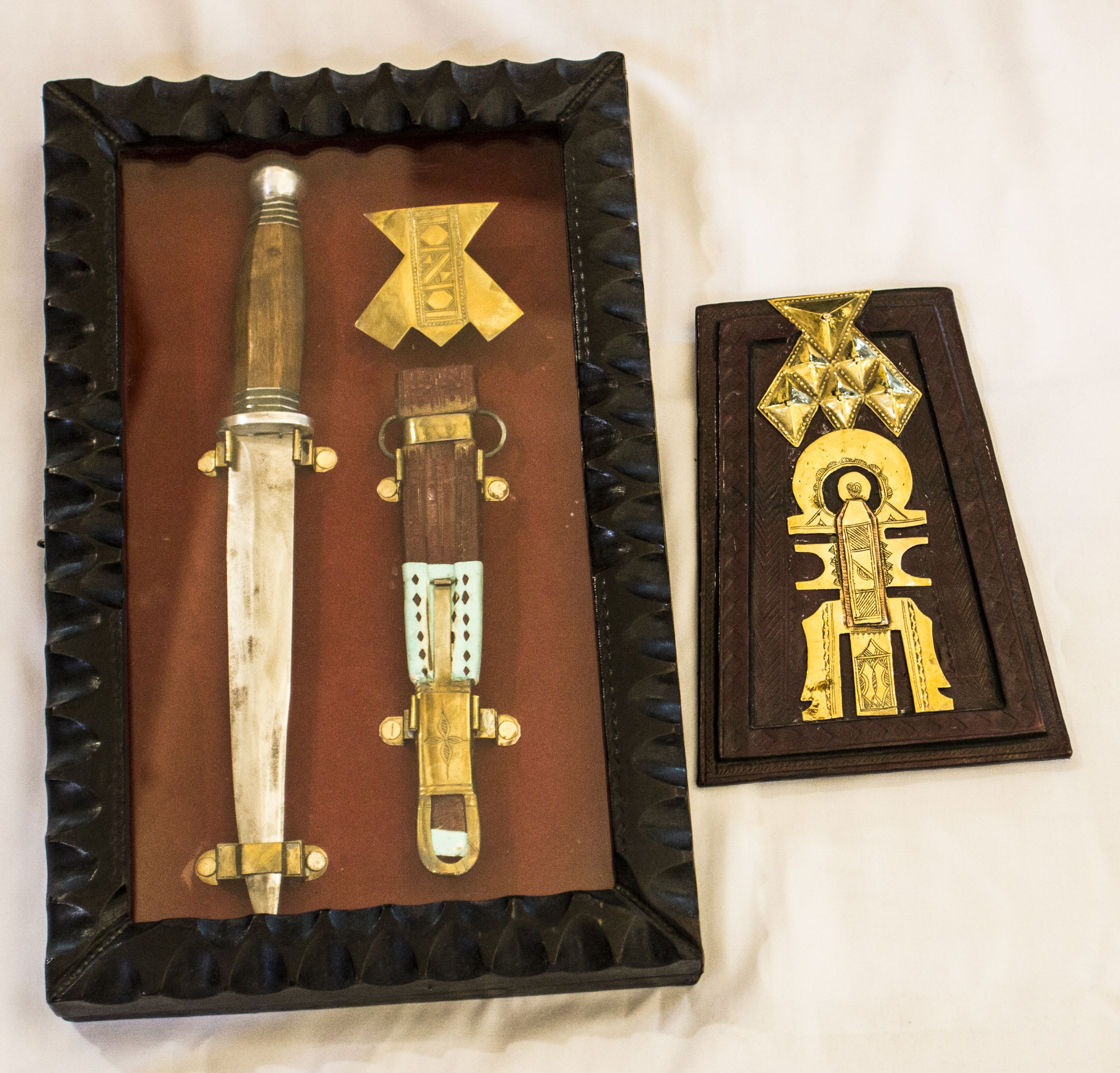 Petit coffret élégant recouvert de cuir et de verre, contenant un couteau traditionnel bien aiguisé, considéré comme l’un des meilleurs couteaux et sabres célèbres d’Algérie, fabriqué avec un soin particulier dans la région de Tamanrasset, alliant qualité, solidité et précision, tout en respectant les traditions artisanales locales.
