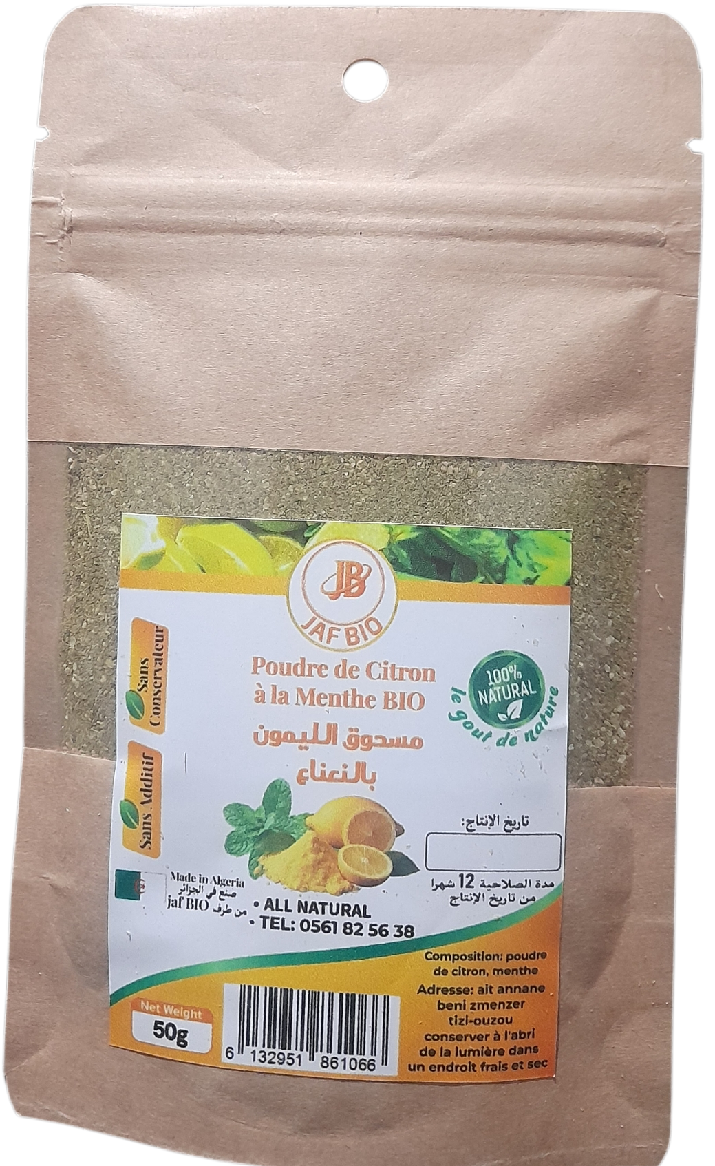 Ingrédients: Citron séché, menthe séché à basse température (séchoir électrique) sans additifs et sans conservateurs