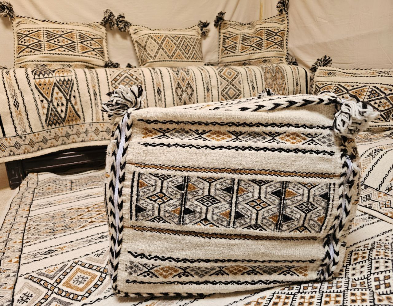 Tapis traditionnels algériens tissés à la main en laine naturelle multicolore, formant un salon traditionnel complet composé de trois petits tapis, chacun accompagné de deux coussins, ainsi qu’un grand tapis, alliant beauté, authenticité et patrimoine algérien.